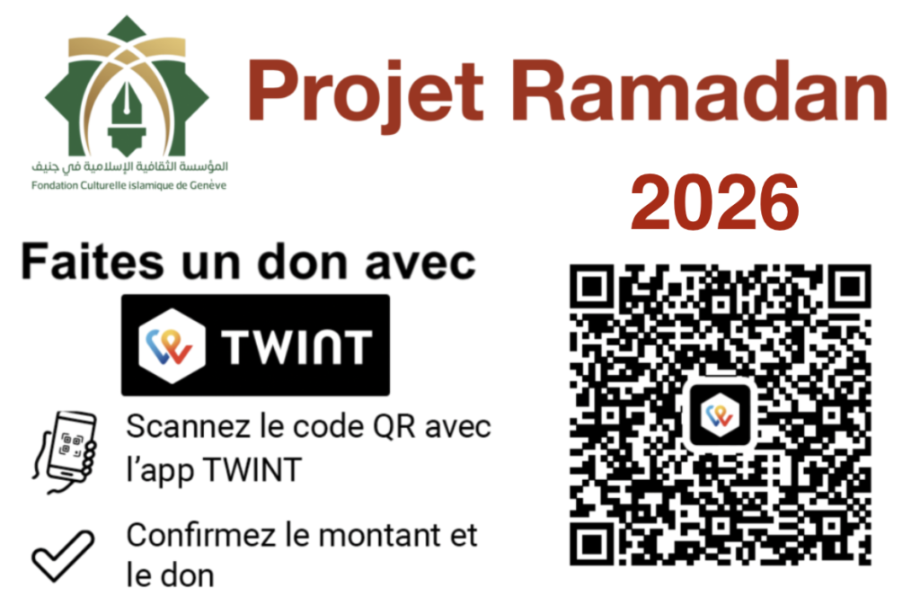 يسر المؤسسة الثقافية الإسلامية في جنيف إعادة إطلاق مشروع افطار صائم خلال شهر رمضان 2026 (1447 هـ) لتقديم الطعام كل مساء لعدد ما بين 400 و 600 شخص كما في السنوات السابقة. يمكنكم المساهمة في تكاليف مشروع رمضان بتبرعاتكم على الكود التالي :